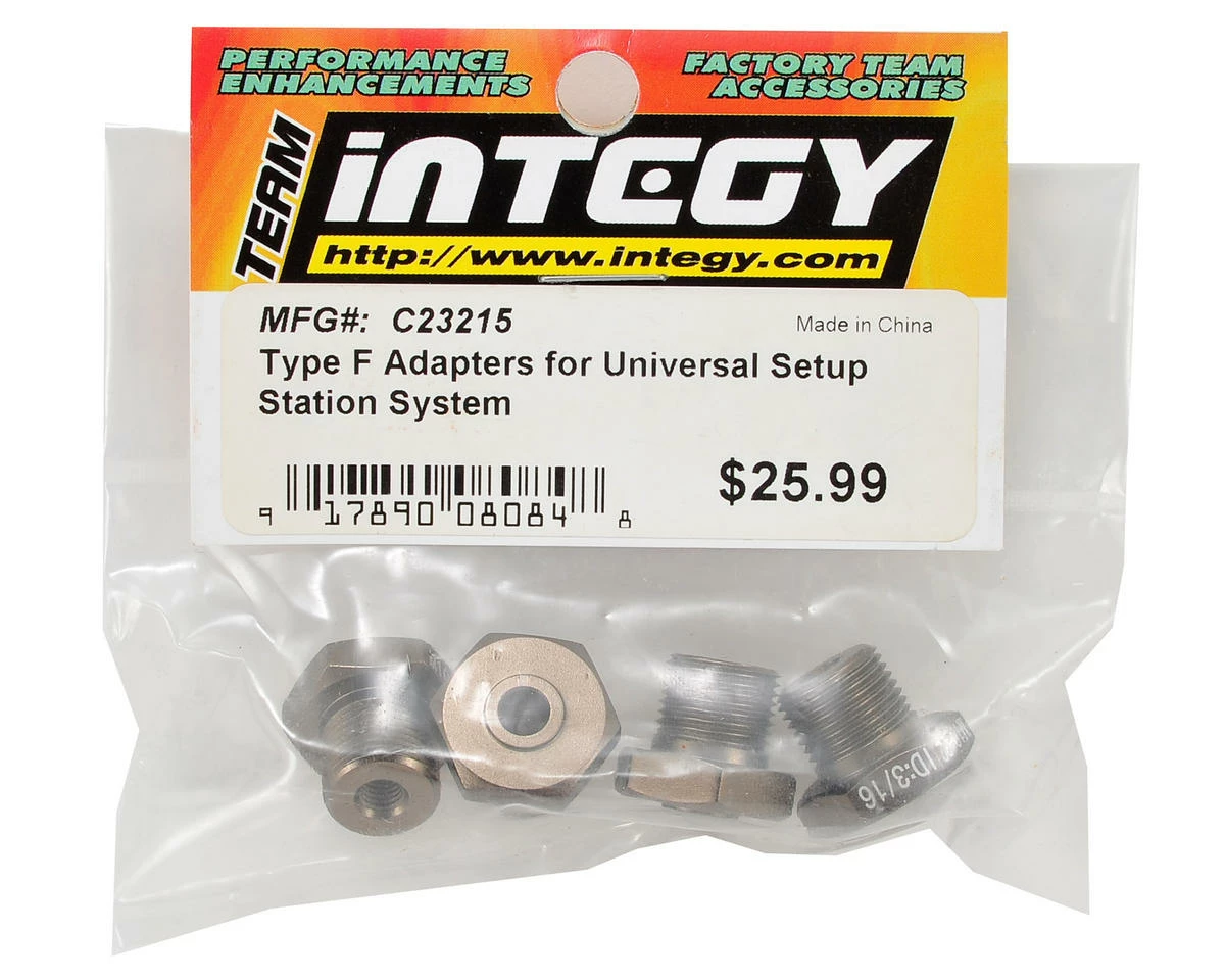 This is an optional Team Integy Universal Setup Station “Type F” Adapter Set. If you have the trick Team Integy Universal Setup Station (INTC23115 or INTC23291) but you need adapters for your specific vehicle, Team Integy offers these adapters that come in a pack of four.