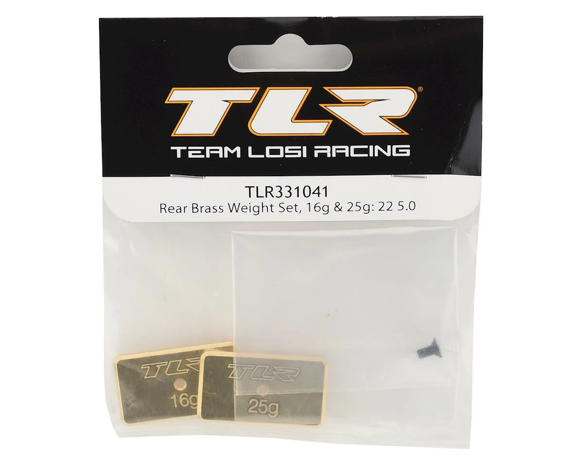 This is a Team Losi Racing Rear Brass Weight Set, intended for use with TLR 22 5.0 1/10 Electric Buggy Kits as an optional part. This rear brass weight set comes with a 16g and a 25g weight.