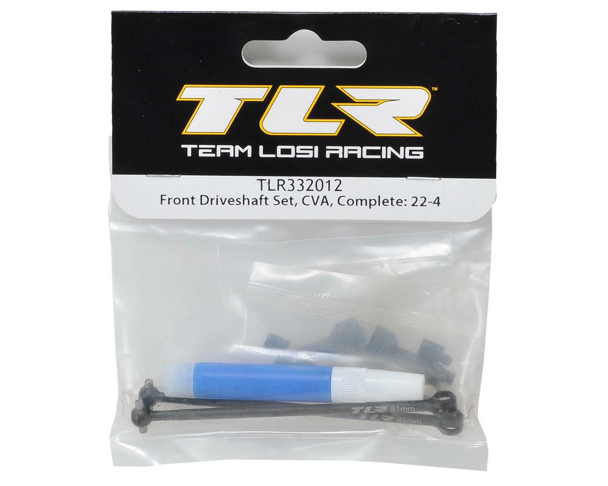This is an optional Team Losi Racing 22-4 Front CVA Driveshaft Set. Designed for the TLR 22-4, the CVA Driveshafts create more “Bone Bind” or “Driveshaft Lock-Up”, thus reducing the suspension movement, especially on power. This allows the car to squat less on acceleration and apply more force directly to the tires to increase traction.
