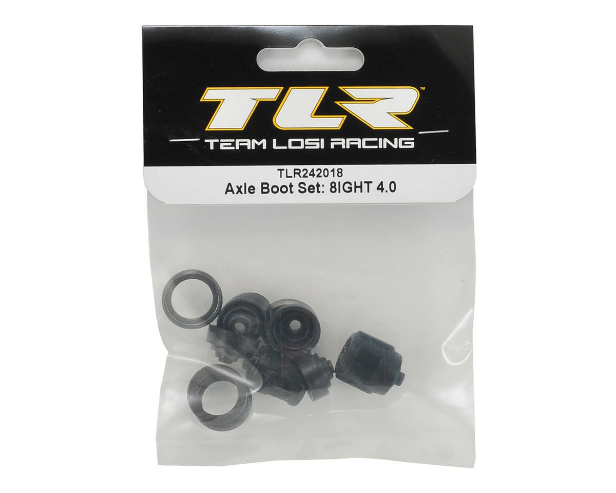 Team Losi Racing 8IGHT 4.0 Axle Boot Set. These are the standard replacement axle boots. Package includes four axle boots and boot retainer rings, as well as two center driveshaft coupler boots. These are used to retain the grease you add to the driveshaft joints, as well as prevent dirt contamination.