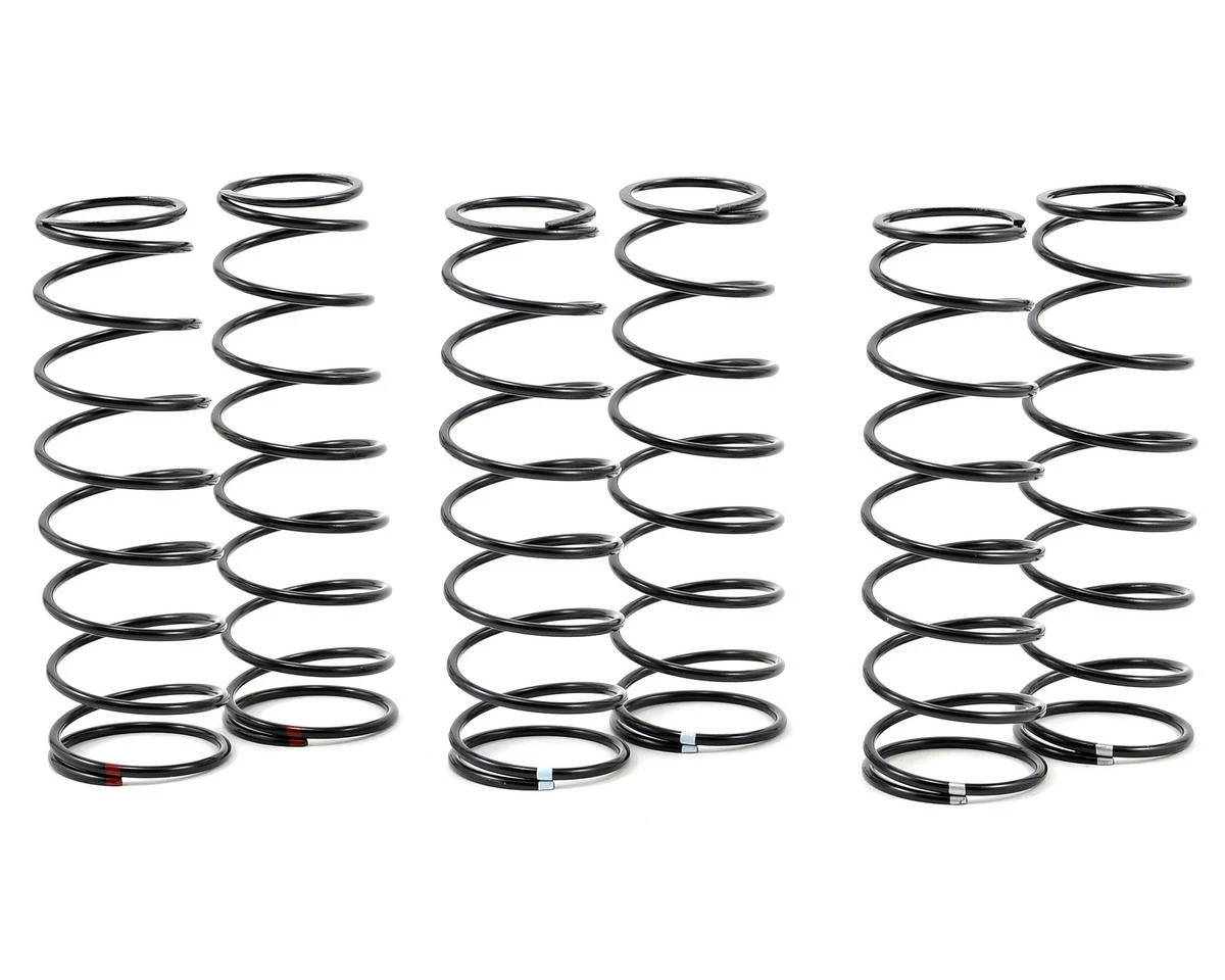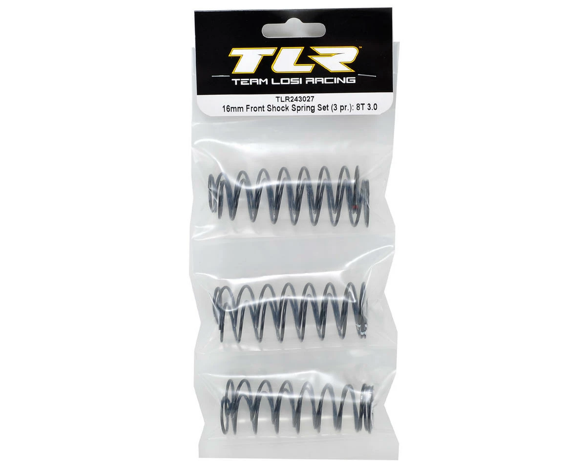This is a Team Losi Racing 8IGHT-T 3.0 16mm Tapered Front Shock Spring Set. The tapered shock springs provide more spring-to-arm clearance and a progressive rate that keeps the ride plush over rough sections of track while still providing plenty of bottoming resistance for landing large jumps. Package includes two silver springs, two white springs and two red springs.