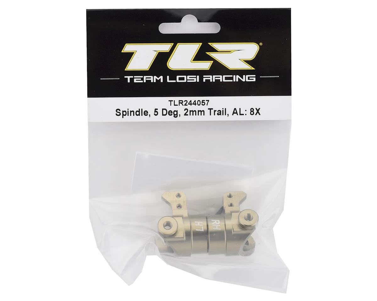 This is a pack of two replacement Team Losi Racing 5° 8IGHT-X Aluminum Spindles. These are the stock spindles included with the 8IGHT-X. These spindles feature 2mm of trail.