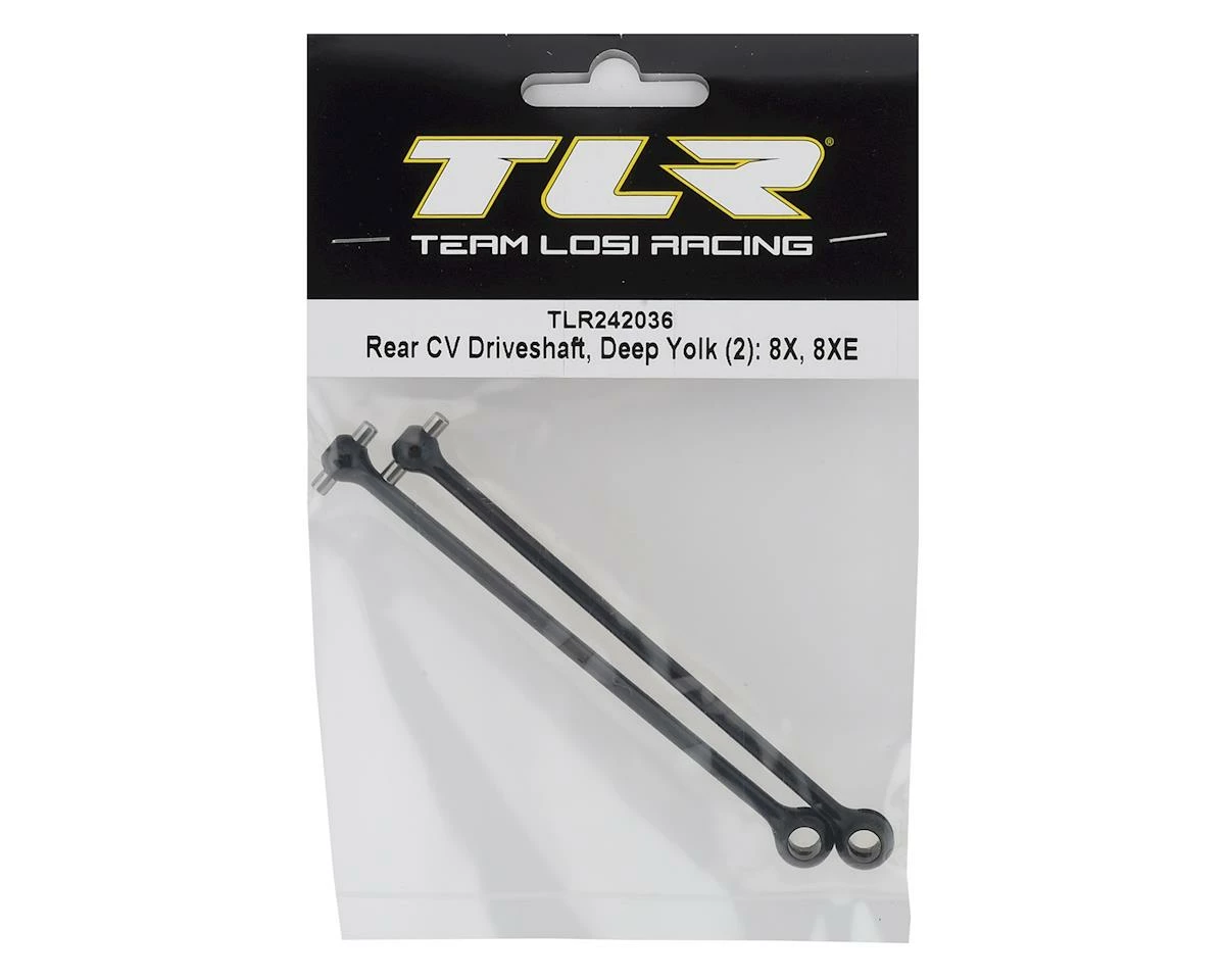 This is a replacement set of two Team Losi Racing Deep Yolk Rear CV Driveshafts, intended for use with the TLR 8IGHT-X Elite 1/8 buggy.Â