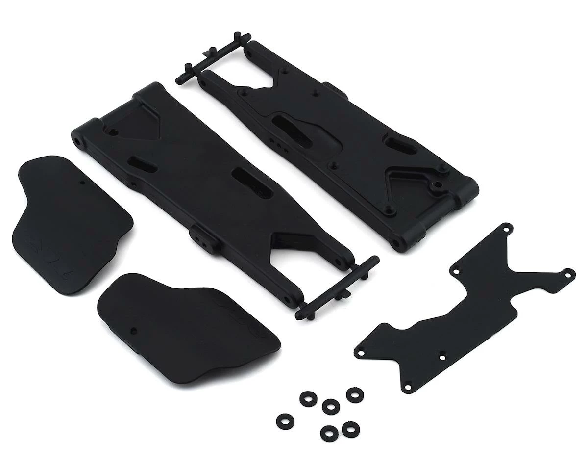 This is a replacement set of two Team Losi Racing 8XT Rear Arms, Mud Guards and Inserts, intended for use with the 8IGHT-XT/XTE 1/8 Nitro/Electric 4WD Off-Road Truggy Kit.