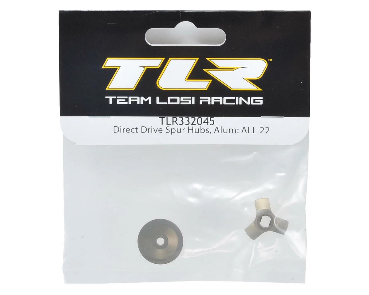 Team Losi Racing Direct Drive Aluminum Spur Hubs. This is a replacement for 22 Series vehicles equipped with the TLR Direct Drive System (TLR332043).