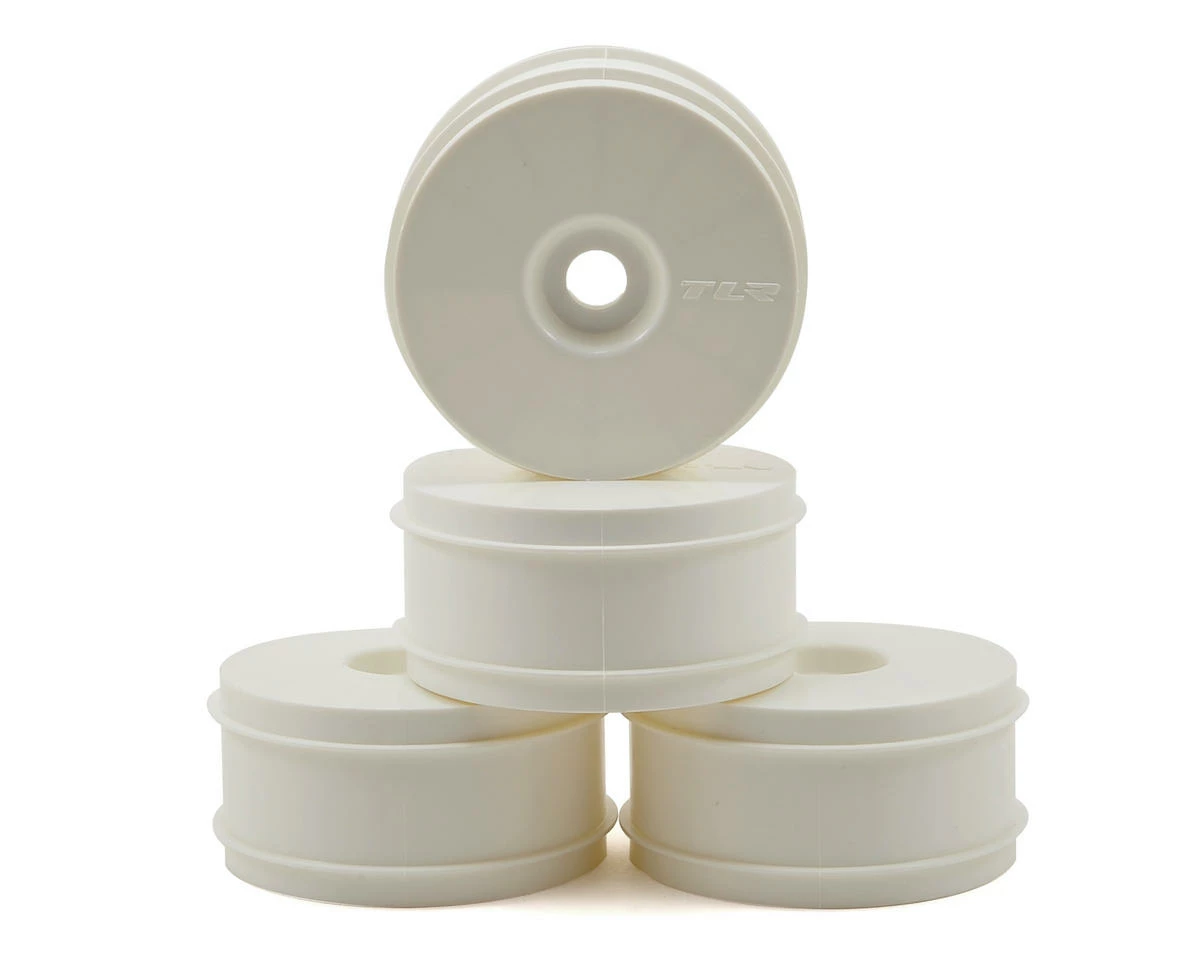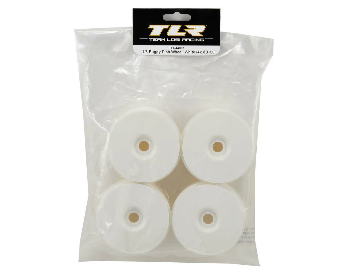 This is a pack of four white Team Losi Racing 1/8 Buggy Dish Wheels. These are the “race-inspired dome wheels” included with the 8IGHT 3.0 buggy, but are compatible with any Losi 1/8 buggy.