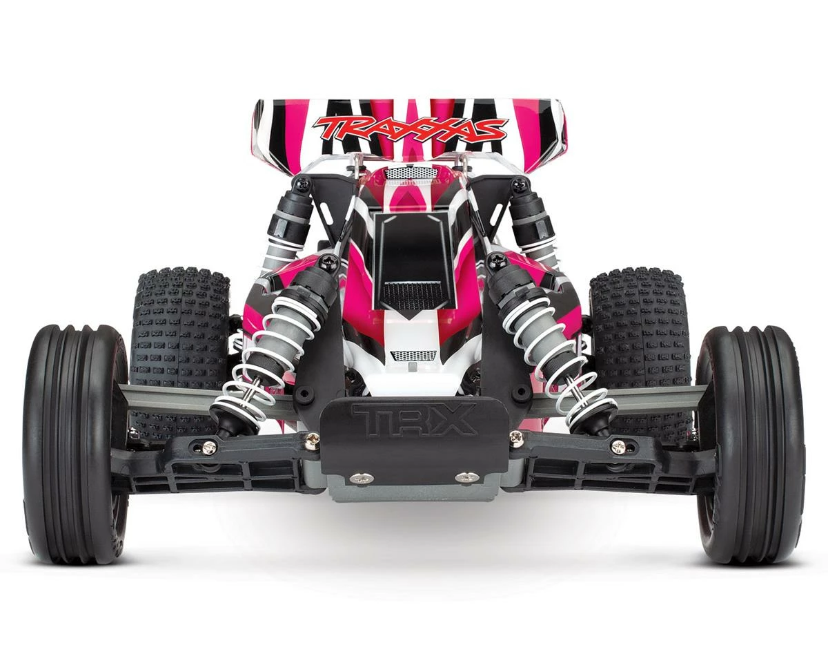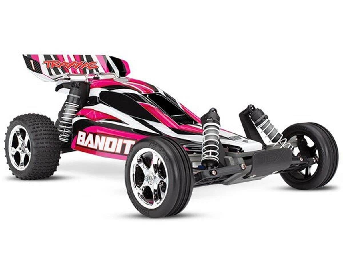 This is the Pink colored Traxxas Bandit Ready to Run 2WD 1/10 scale electric buggy, with an included Waterproof XL-5 ESC, 2.4GHz Radio, 7-cell 3000mAh NiMH Battery and Peak Detecting DC Charger. Now featured with this kit are the updated Traxxas iD connectors now included as standard equipment.