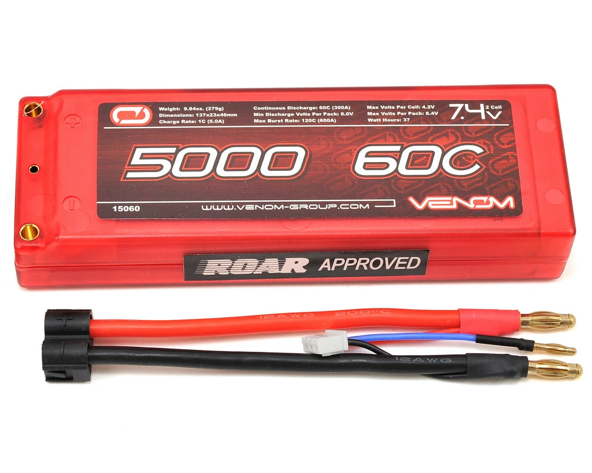 This is the Venom Power 2S2P Li-Poly 60C 5000mAh Battery Pack with Universal Connector. Venom’s LiPO batteries have high discharge rates perfect for high performance applications and come in a large variety of sizes. Venom’s LiPO batteries feature a balance plug for checking individual cell voltages and balancing. Battery is encased in a ROAR approved hard plastic case for better durability for day to day use, and to protect it in a crash. Includes JST-XH balance plug for easy cell balancing. Includes pre-installed Universal Connector.