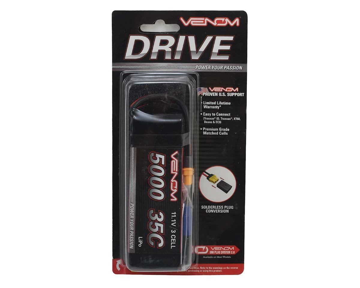 The Venom 35C 3S 5000mAh 11.1V LiPo Battery has the features you have come to depend on from Venom: 12 AWG soft silicone wire leads with the patented High Current Universal 2.0 Plug System, along with the power to handle even the toughest terrains.