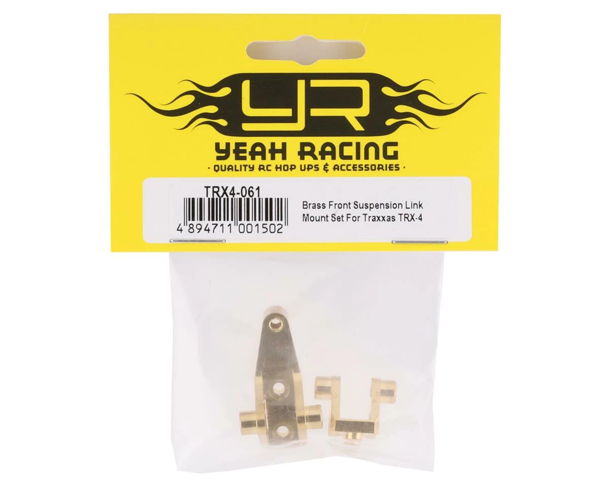Yeah Racing Traxxas TRX-4/TRX-6 Brass Front Suspension Link Mount Set. This optional suspension link mount is great for adding a little weight and more structural strength to the Traxxas TRX-4 or TRX-6. Package includes one front suspension link mount set.